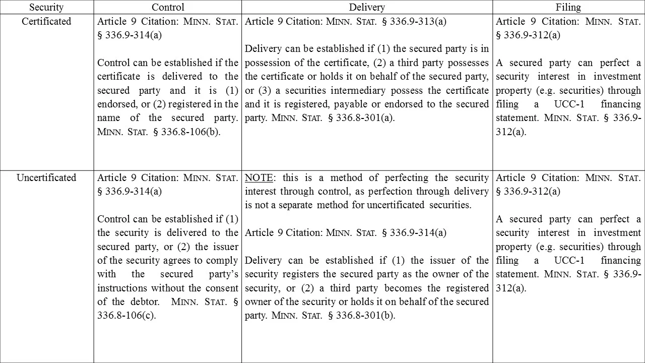 If the terms of the limited liability company interest expressly provide that it is a security governed by Article 8 of the UCC, then there are three general methods to perfect: control, delivery and filing. In that event, and as summarized in the below table, there are some differences depending on whether the security is represented by a certificate or not.